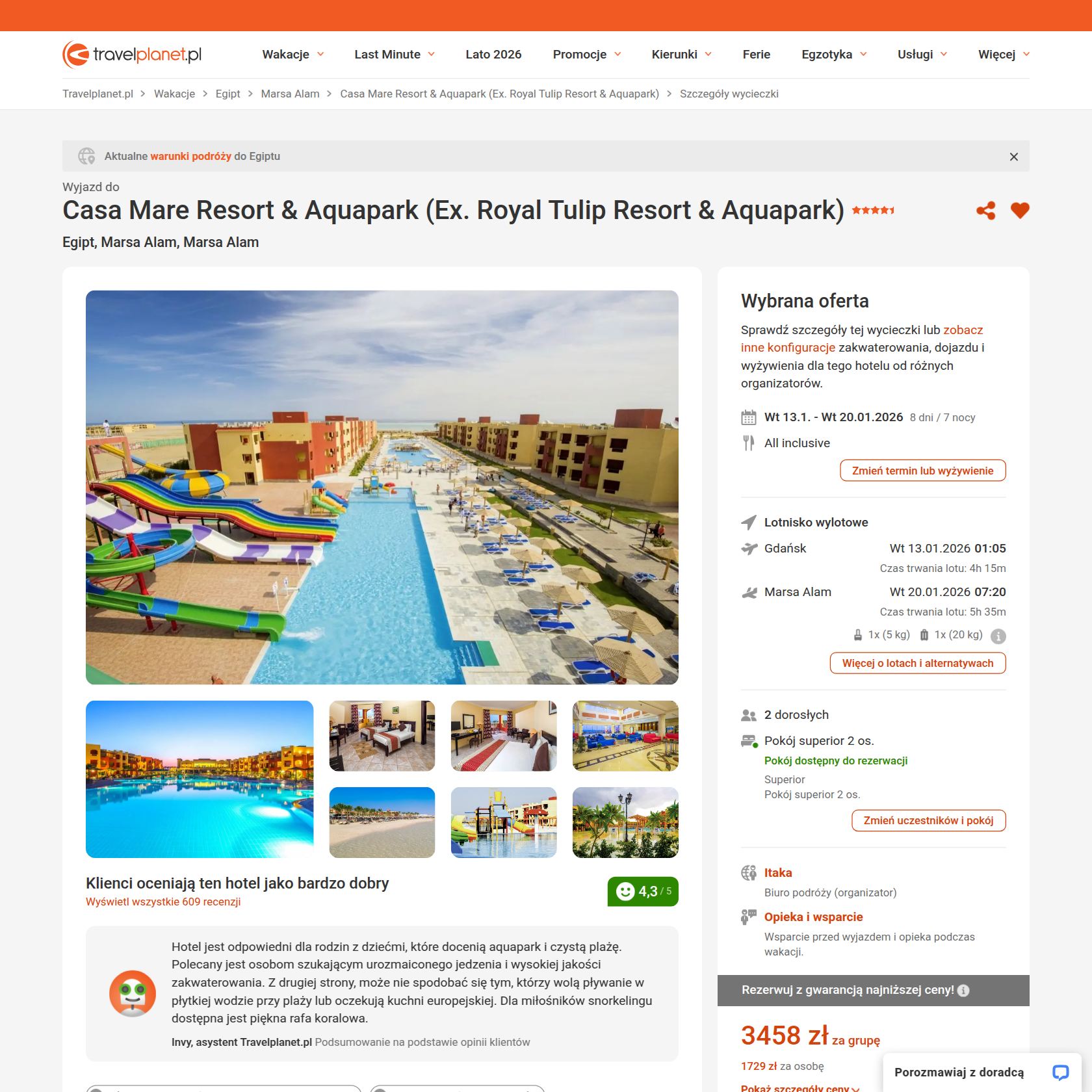 W cenie otrzymujesz przeloty w obie strony, 7 noclegów w wybranym pokoju, all inclusive (śniadania, obiady, kolacje, przekąski oraz lokalne napoje alkoholowe i bezalkoholowe), podstawowe ubezpieczenie oraz opiekę rezydenta.