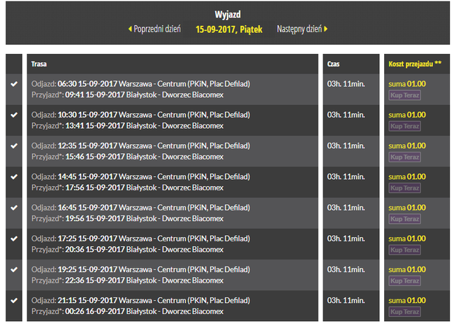 Bilety rezerwujecie na stronie przewoźnika PlusBus.pl Płatność przelewem lub kartą płatniczą. Do każdego biletu doliczana jest opłata rezerwacyjna 1 PLN. Jeżeli na jednej rezerwacji są 4 bilety, system doliczy 4 PLN opłaty. Bilety są imienne. Imię i nazwisko pasażera podajemy podczas rezerwacji. Możemy zdecydować czy bilet otrzymamy elektronicznie czy będzie do odbioru u kierowcy.