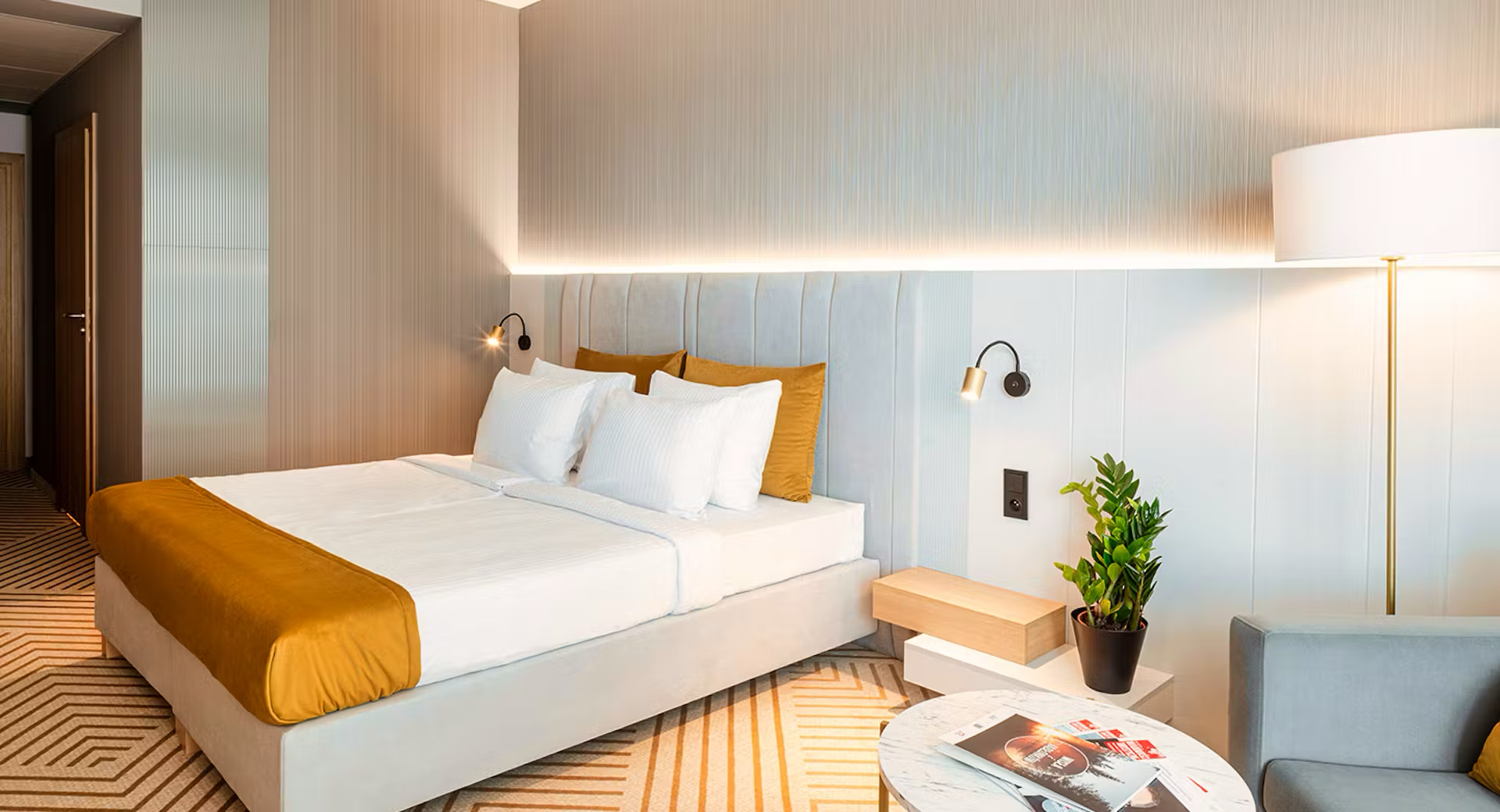 W cenie pobytu otrzymasz zakwaterowanie w nowocześnie urządzonym pokoju oraz codziennie śniadania w formie bufetu. W pakiecie dostaniesz również dostęp do Blue Lagoon – jednego z największych hotelowych aquaparków w Polsce oraz basenu zewnętrznego i siłowni.