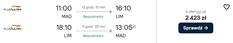 Propozycja składa się z dwóch oddzielnych rezerwacji. Pierwsza z nich to loty na trasie Katowice – Madryt– Katowice w terminie 17 maja-1 czerwca lub Warszawa – Madryt – Warszawa w terminie 16-31 maja. Druga to Madryt – Lima – Madryt w terminie 18-29 (30) maja. Do Madrytu polecisz linią Wizz Air natomiast do Peru Plus Ultra. W przypadku obu linii lotniczych w cenę wliczony został bagaż podręczny.